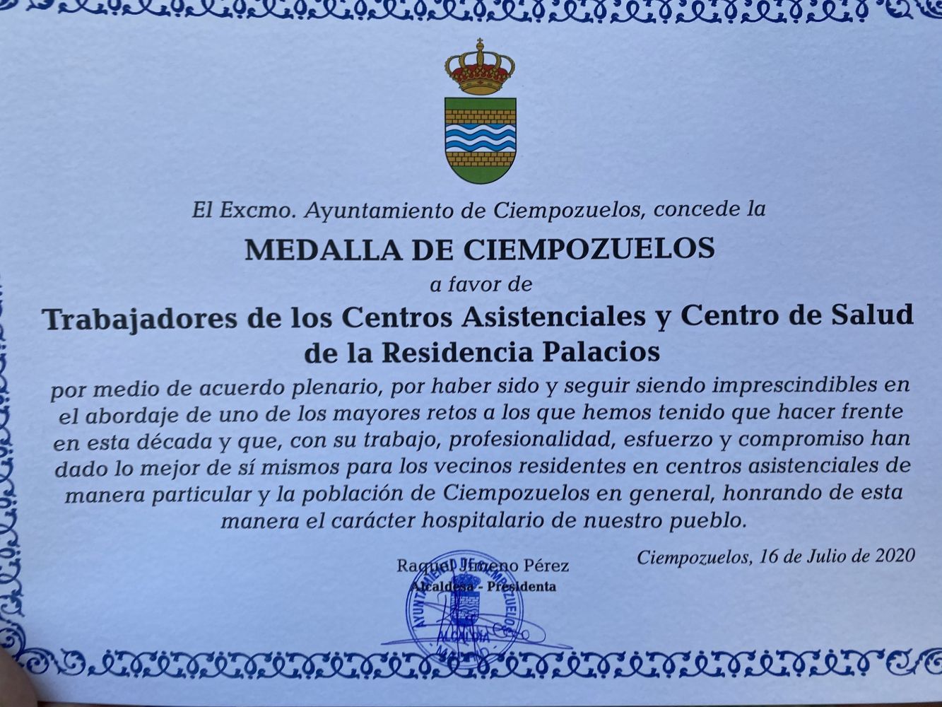 La semana pasada el Ayuntamiento, otorgo la Medalla de Ciempozuelos a todos los Trabajadores de los Centros Asitenciales del Municipio. Gracias por este gesto al @ayuntamientociempozuelos y a todas las corporaciones.